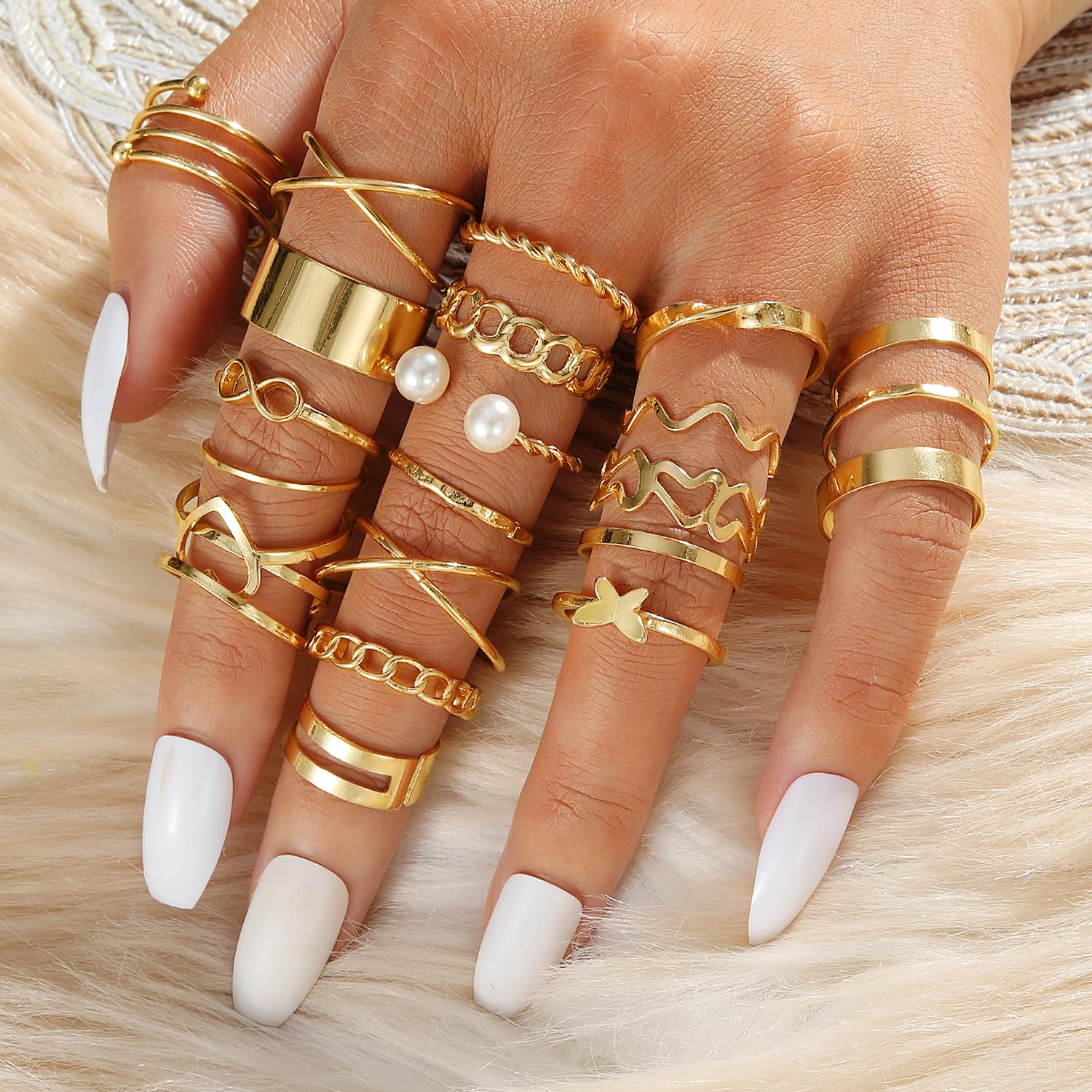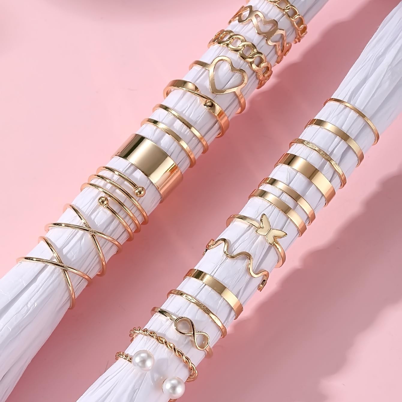A szett részeként arany színű, különféle mintázatú gyűrűket is találsz: szív, gyöngy, pillangó, lánc és geometrikus formák. Viselheted őket külön-külön vagy egyszerre rétegezve, hogy mindig mást mutass a kezeiden.