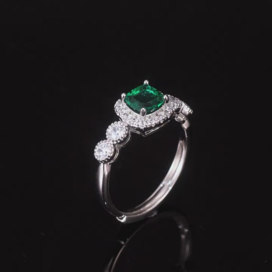 A központi zöld kő (különböző formákban elérhető) körül apró, csillogó kövek találhatók, amelyek kiemelik a fő kő mélységét és ragyogását. A geometrikus forma modern, mégis retró hangulatot sugároz.
