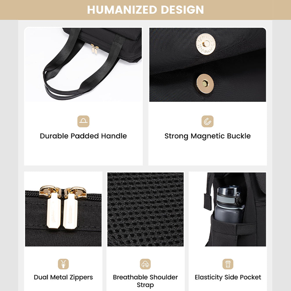 A párnázott, légáteresztő pántok egész napos kényelemről gondoskodnak, míg a kiváló minőségű poliészter anyag a hosszan tartó viseletről. Stílusos arany cipzáras részletek teszik teljessé az elegáns megjelenést.