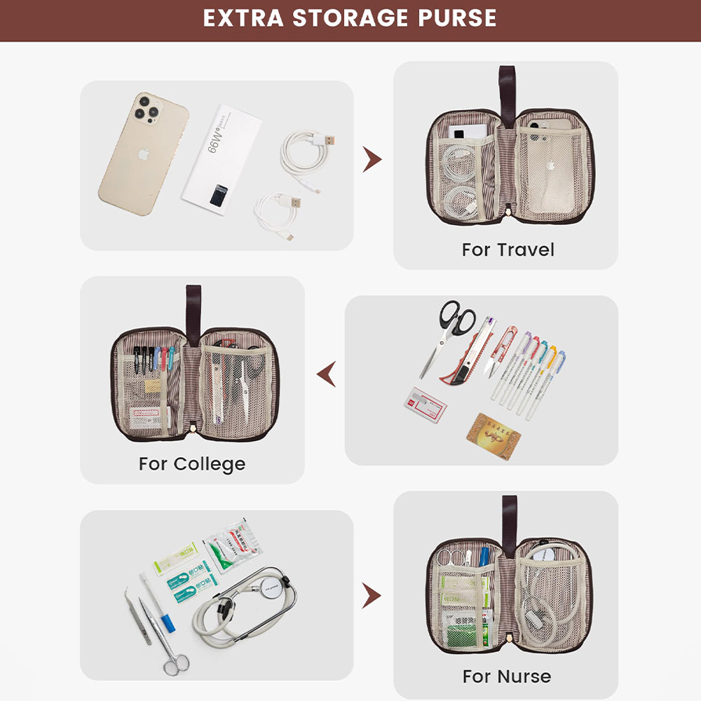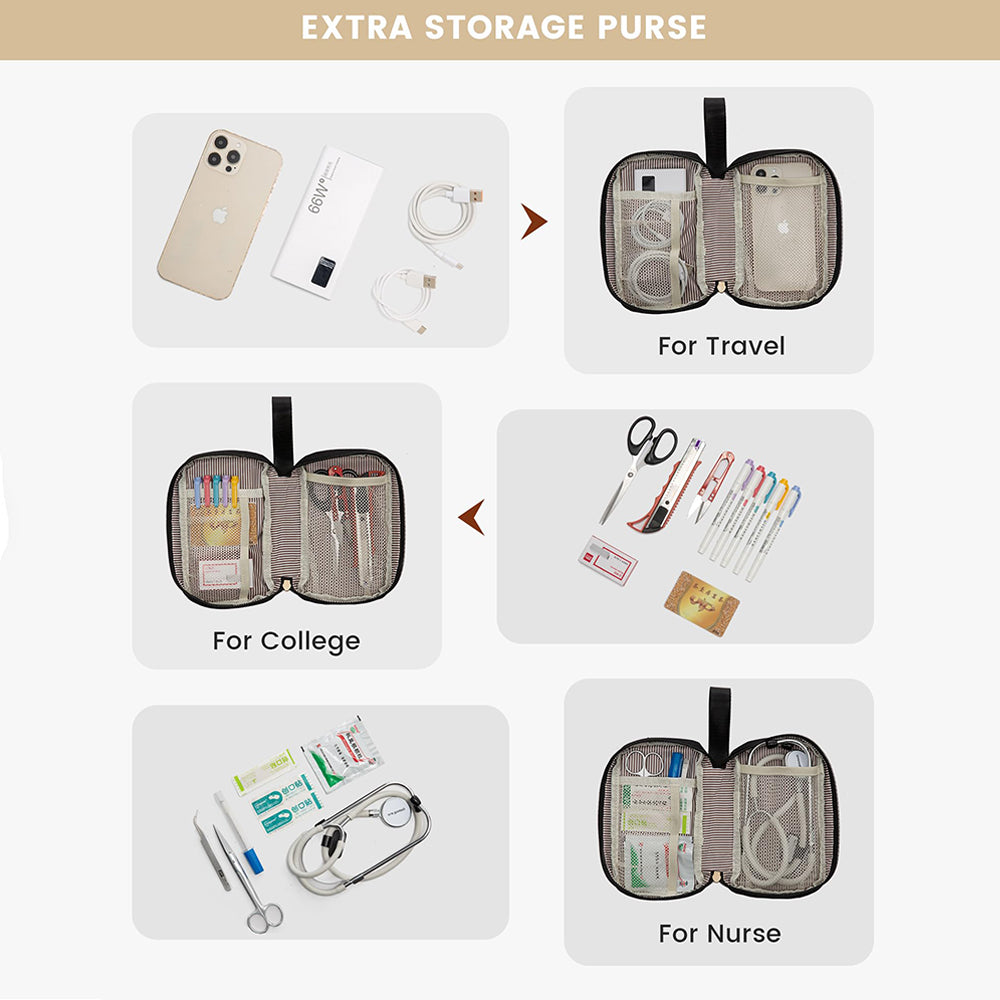 A hátizsákhoz tartozik egy kompakt kábelkezelő doboz is (20x14x6 cm), amely ideális kábelek, tartozékok vagy ápolási felszerelések tárolására. Könnyen elfér a hátizsákban, így mindig rendben tarthatja fontos tárgyait.