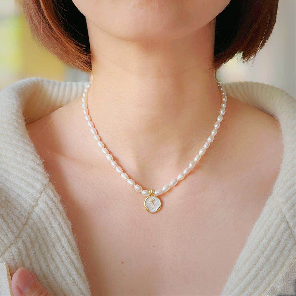 A francia romantika és a vintage nőiesség letisztult esszenciája. A lágy fényű gyöngysor finoman kiemeli a nyakat, a gyöngyházfényű, kézzel zománcozott virág medál pedig (rózsa vagy tulipán motívummal) azonnal különlegessé teszi a megjelenést.