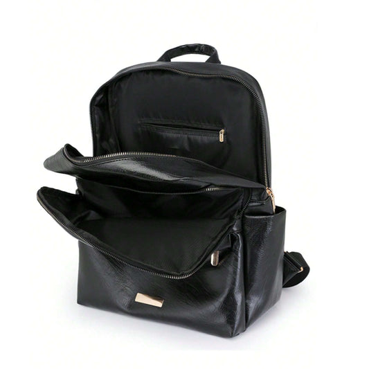Dollcini Divatos Nagy Kapacitású Női Hátizsák – PU Bőrpántos, Minimalista, Iskolába, Munkába és Utazáshoz, Fényes Fekete