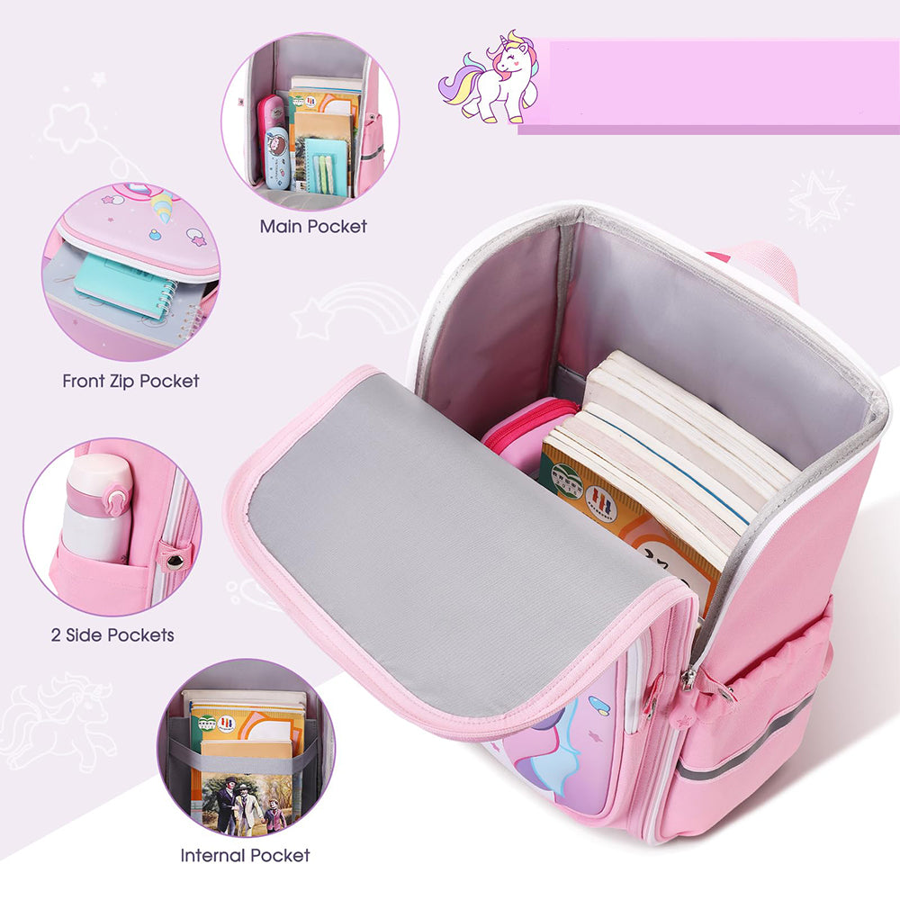 - Fő rekesz: Két különálló védőréteggel, amely elegendő helyet biztosít tankönyvek, füzetek és egyéb iskolai felszerelések számára.