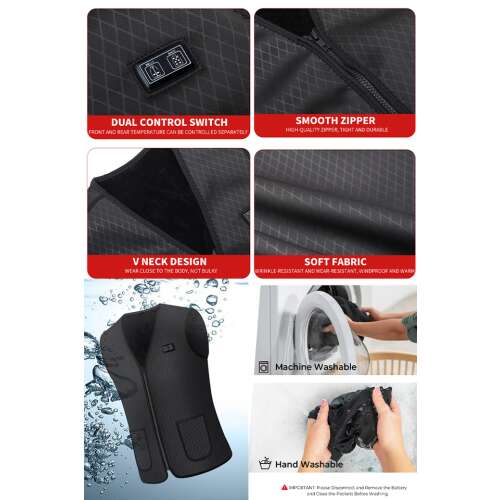 Biztonságos mosás és szárítás: Könnyen kezelhető és mosógépben mosható, a kabát testvédelemmel rendelkezik, és azonnal leáll, ha túl magas hőmérsékletre emelkedik. Tisztítás előtt húzza ki a tápegységet, és tegye a zsebébe az USB-csatlakozót. Egy év garancia.