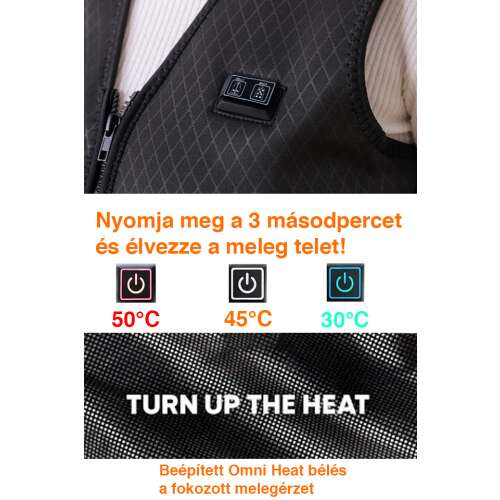 Három fokozatú fűtés: 3 fűtőkar (magas, közepes és alacsony fokozat). Változtassa meg a kabát hőmérsékletét egy gombnyomással. Ügyeljen arra, hogy ne veszítse el a felesleges hőt, és élvezze a kellemes meleget.