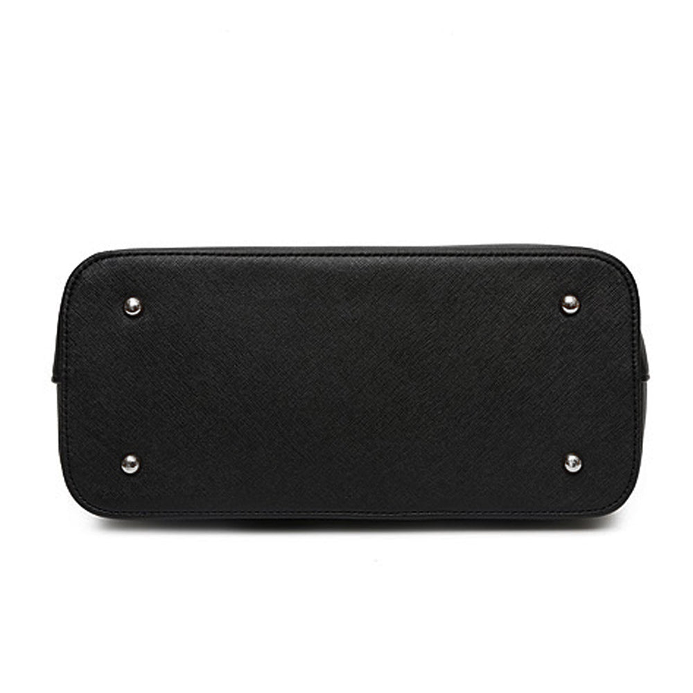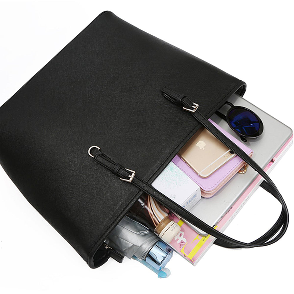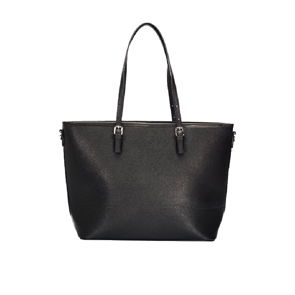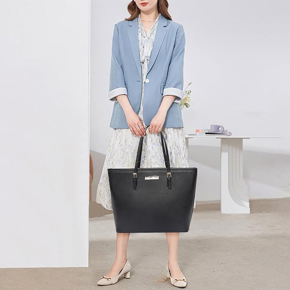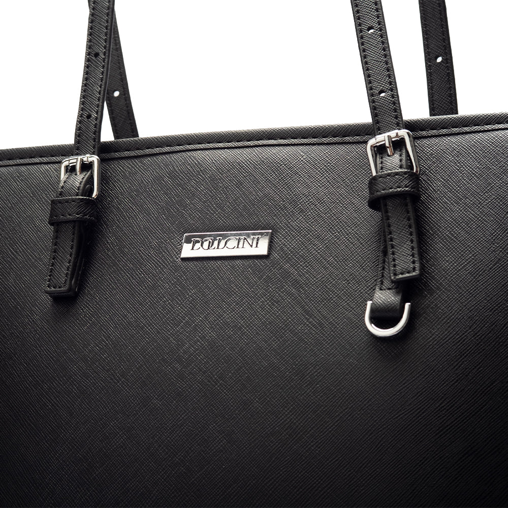 A Dollcini klasszikus fekete nagyméretű női kézitáska a letisztult elegancia és a praktikusság tökéletes kombinációja. Prémium műbőrből készült, amely vízlepergető és kopásálló, belsejében pedig jól rendszerezhető rekeszek segítik a mindennapi használatot. Tágas kialakítása lehetővé teszi laptop, dokumentumok, pénztárca és más kiegészítők kényelmes tárolását. Elegáns részletei és minimalista stílusa miatt irodai, hétköznapi és utazási szettekhez is ideális választás.