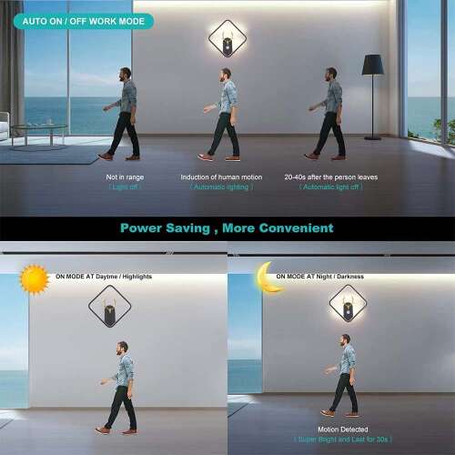 A mozgást kb. 3–5 méteren belül érzékeli, sötétben automatikusan felkapcsol, majd rövid idő után kikapcsol – ideális éjjeli fénynek, közlekedőbe vagy lépcső mellé.