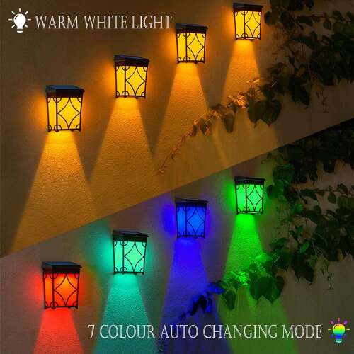 Retro napelemes kerítéslámpák: Minden kerítéslámpa 2 LED gyöngyöt tartalmaz, RGB lámpák és borostyánsárga lámpák állnak rendelkezésre. A tetõ alakú napelemek és a lámpaház mintázata retró kis kerti díszléccé teszi.