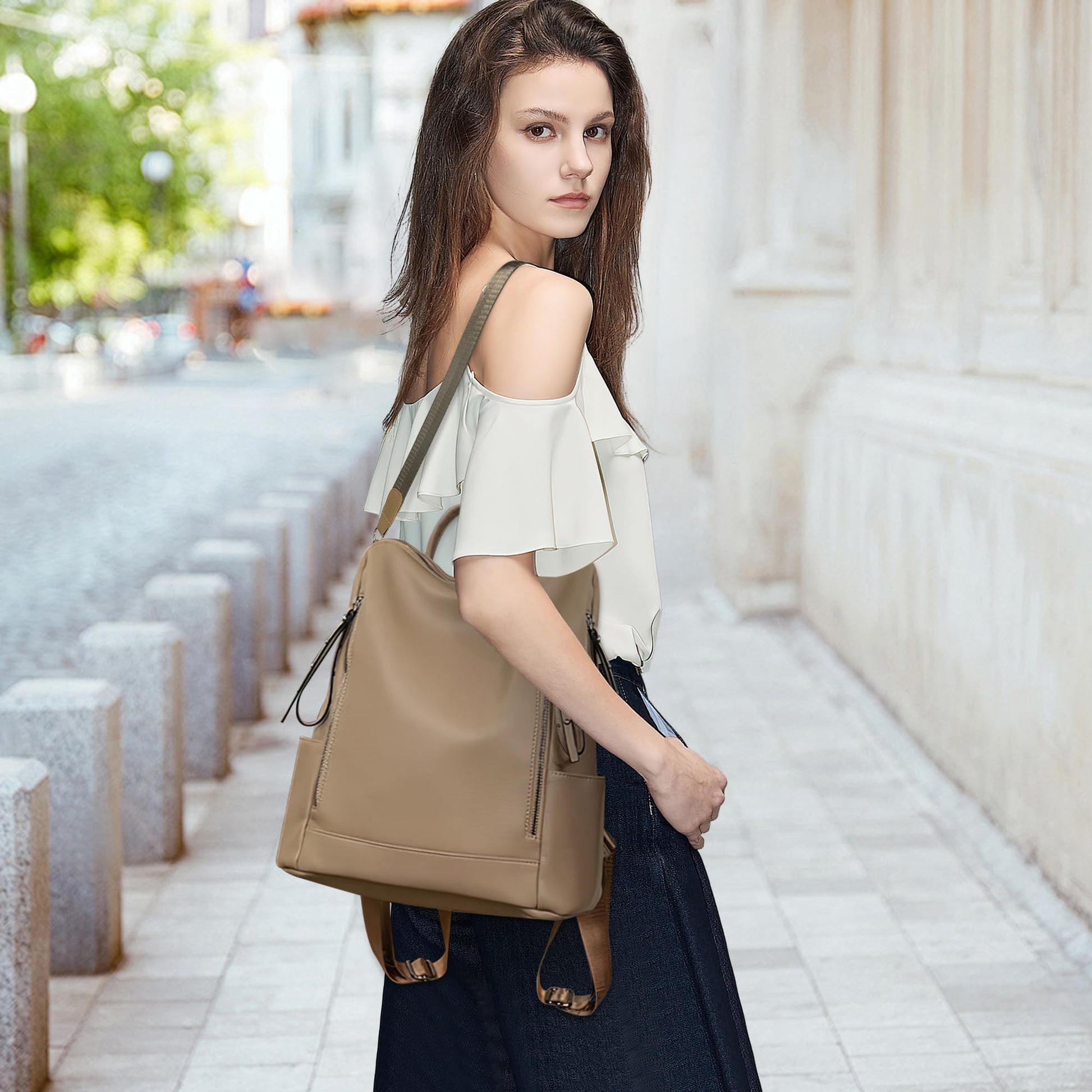 A Dollcini női hátizsák azok számára készült, akik egy elegáns, mégis praktikus táskát keresnek mindennapi használatra. Ez a modell kétféle prémium anyagból érhető el: strapabíró, vízálló nylon vagy elegáns, puha PU bőr kivitelben. Mindkét változat azonos méretű és kialakítású, így kiválaszthatja az igényeinek és stílusának leginkább megfelelő verziót.