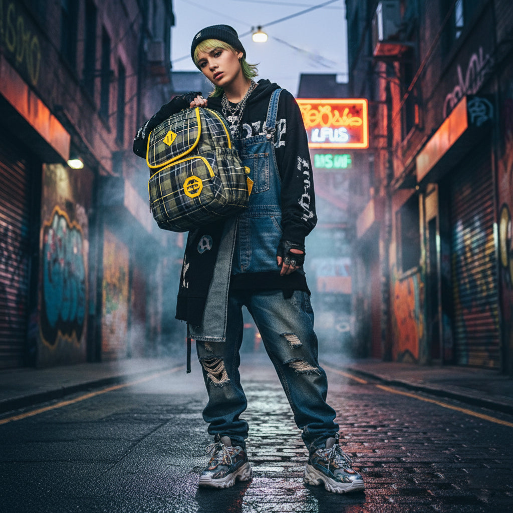 - Karakteres Dizájn: A klasszikus zöld és szürke alapon futó kockás minta és a vibráló sárga részletek egyedi és feltűnő külsőt kölcsönöznek a táskának.